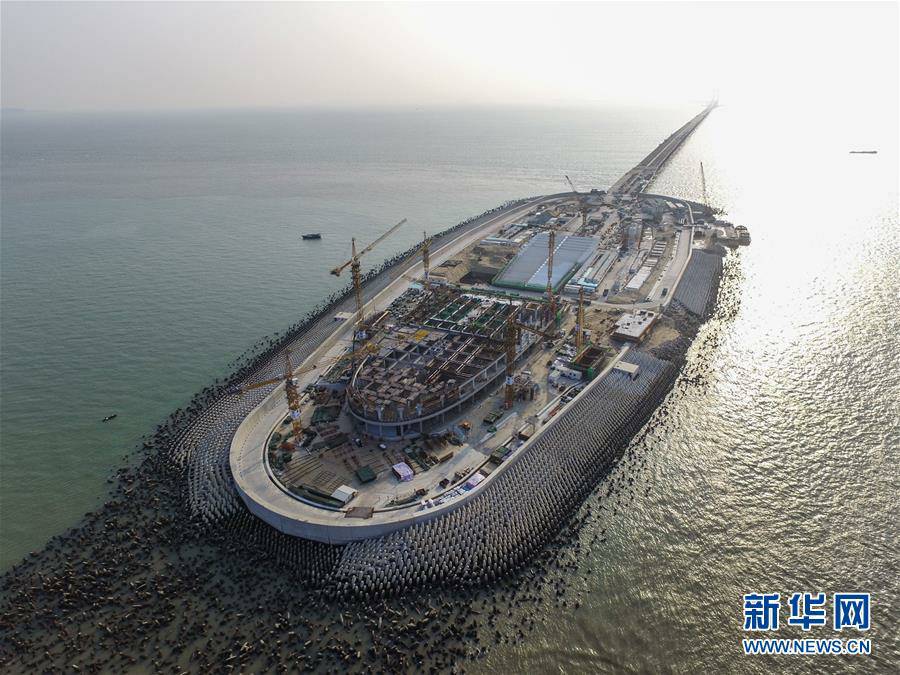 这是鸟瞰港珠澳大桥建设中的西人工岛(4月28日摄)。创下多项世界之最,桥岛隧合一的港珠澳大桥海底隧道工程部门最终接头于5月2日正式吊装沉放,它的对接成功将标志着全长5664米的海底隧道全线合龙。新华社记者 刘大伟摄