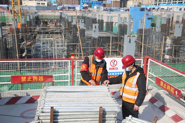 走进工地,一个巨大的基坑映入眼帘,随处都是忙碌施工的工人和大型器械。伴着微微轰鸣声,3台塔吊正在接续不断地向基坑内吊运建筑材料,工人们正在进行地下一层、地下二层的钢筋绑扎作业,工程进展紧张有序、忙而不乱。